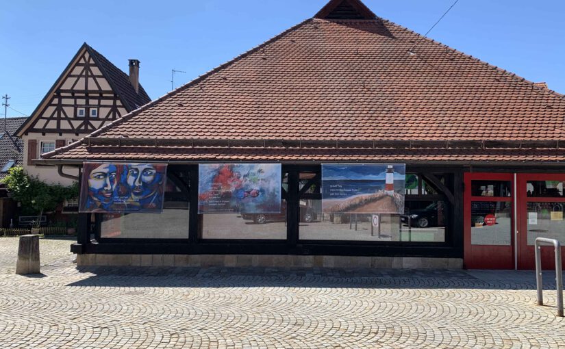 Die Banner aus der ersten Hängung, der ersten Welle sozusagen, gehen jetzt in der Stadt auf Wanderschaft in die Teilorte. Sie werden im Neugreuth am Evangelischen Gemeindezentrum, in Neuhausen an der Kelter und in Glems am Obstbaumuseum Kunst zu den Menschen bringen.
